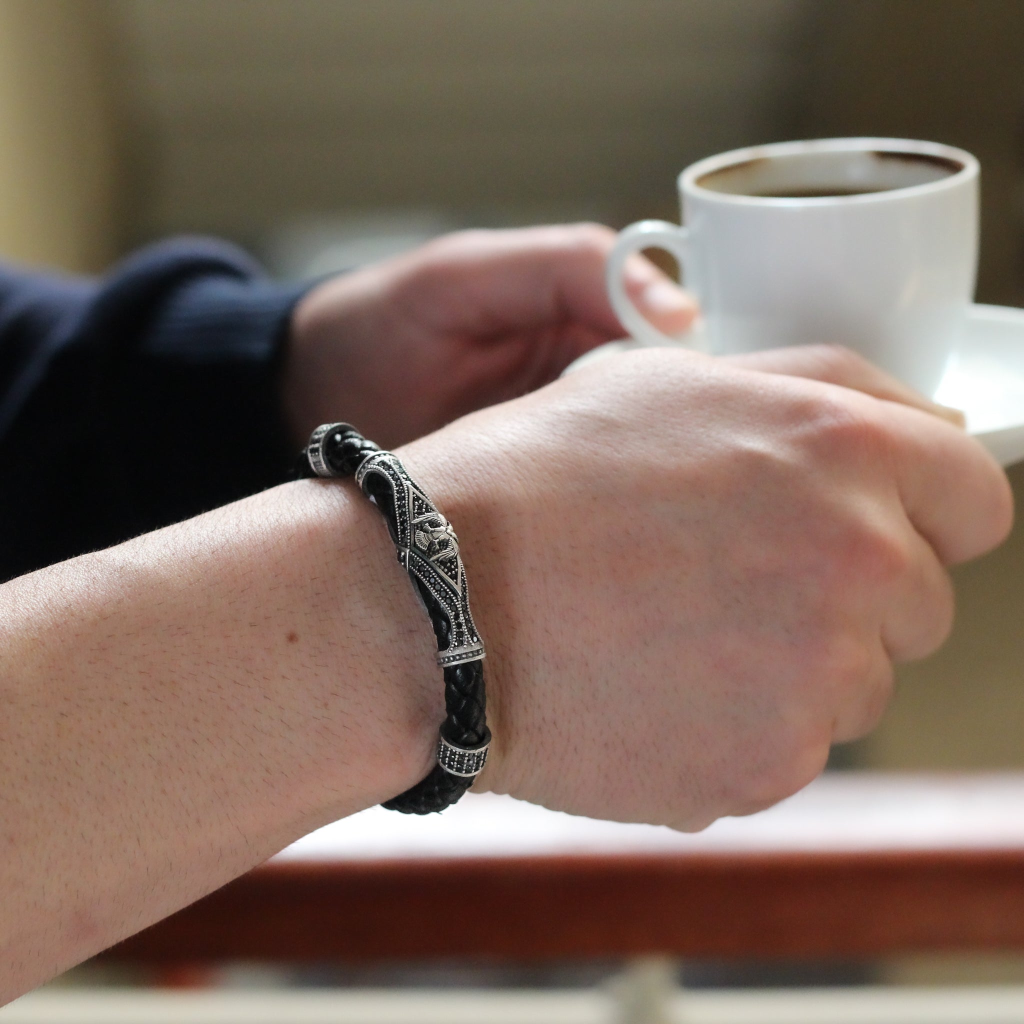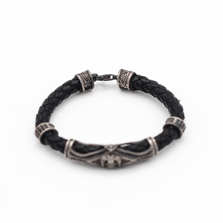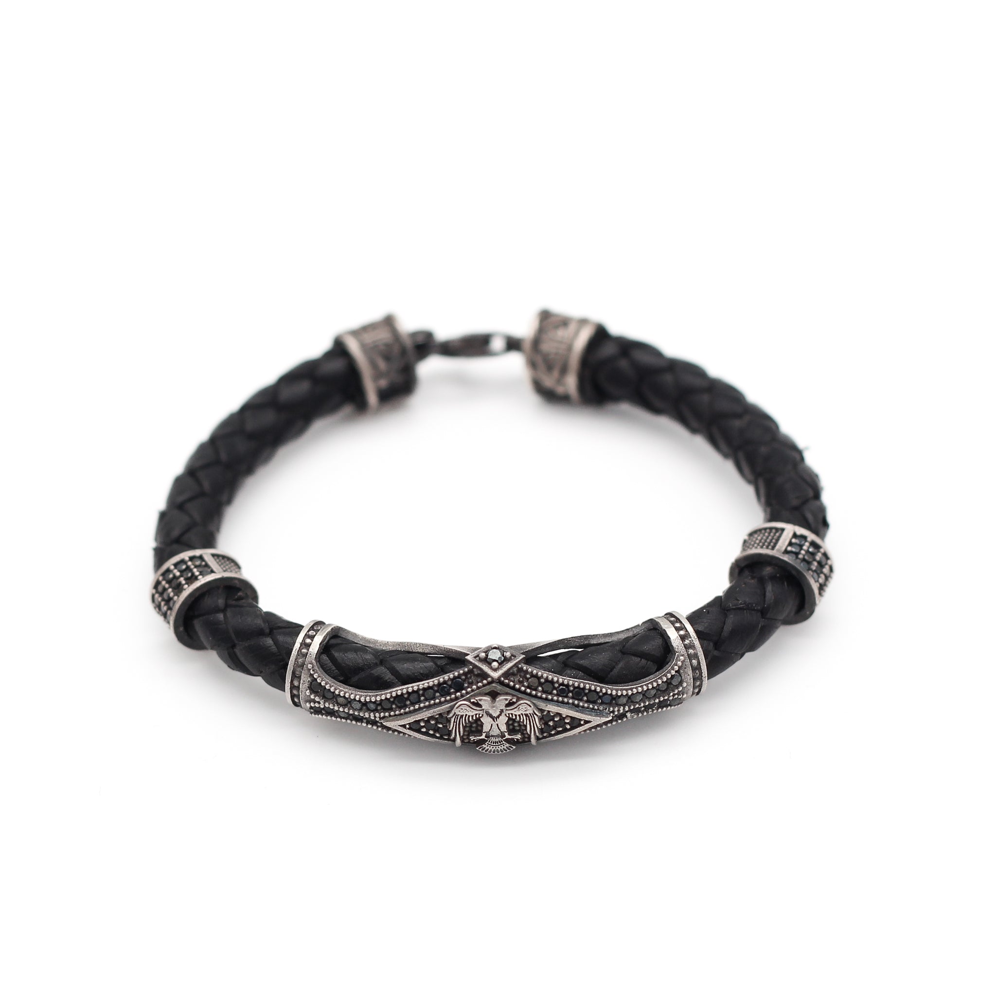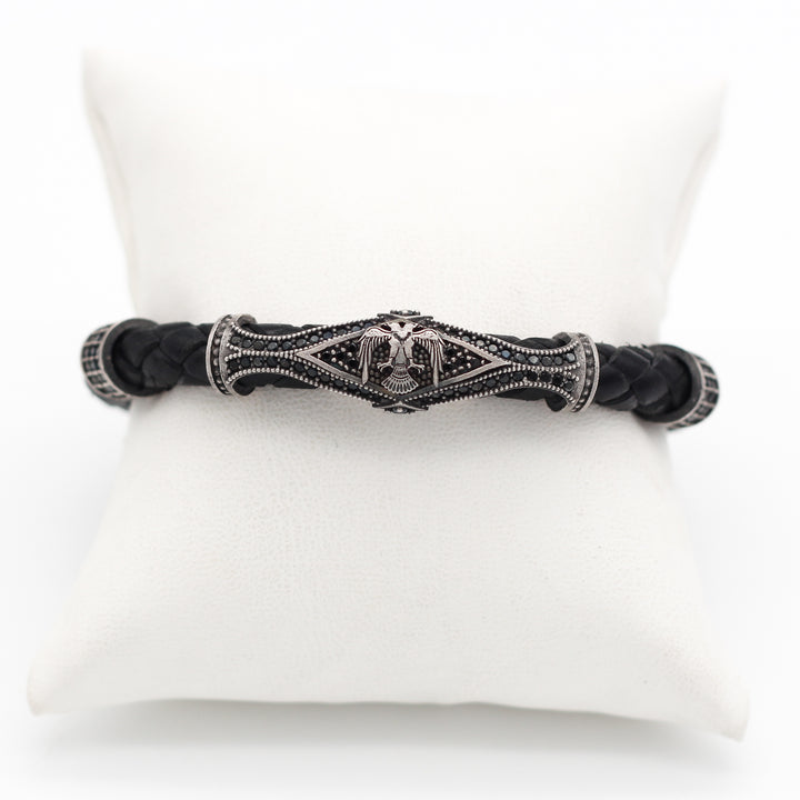 Exude power and sophistication with this Sterling Silver and Leather Men's Bracelet, showcasing a bold double-headed eagle motif as its centerpiece. Crafted with braided leather and 925K sterling silver, this bracelet is enhanced with sparkling zircon accents, combining rugged durability with an elegant design. Perfect for men who value unique and regal accessories, this bracelet is suitable for both casual and formal wear.