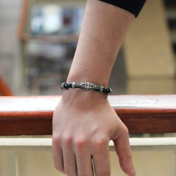 925K Sterling Silver and Leather Men's Bracelet with Double-Headed Eagle Motif | Unique Jewelry Men