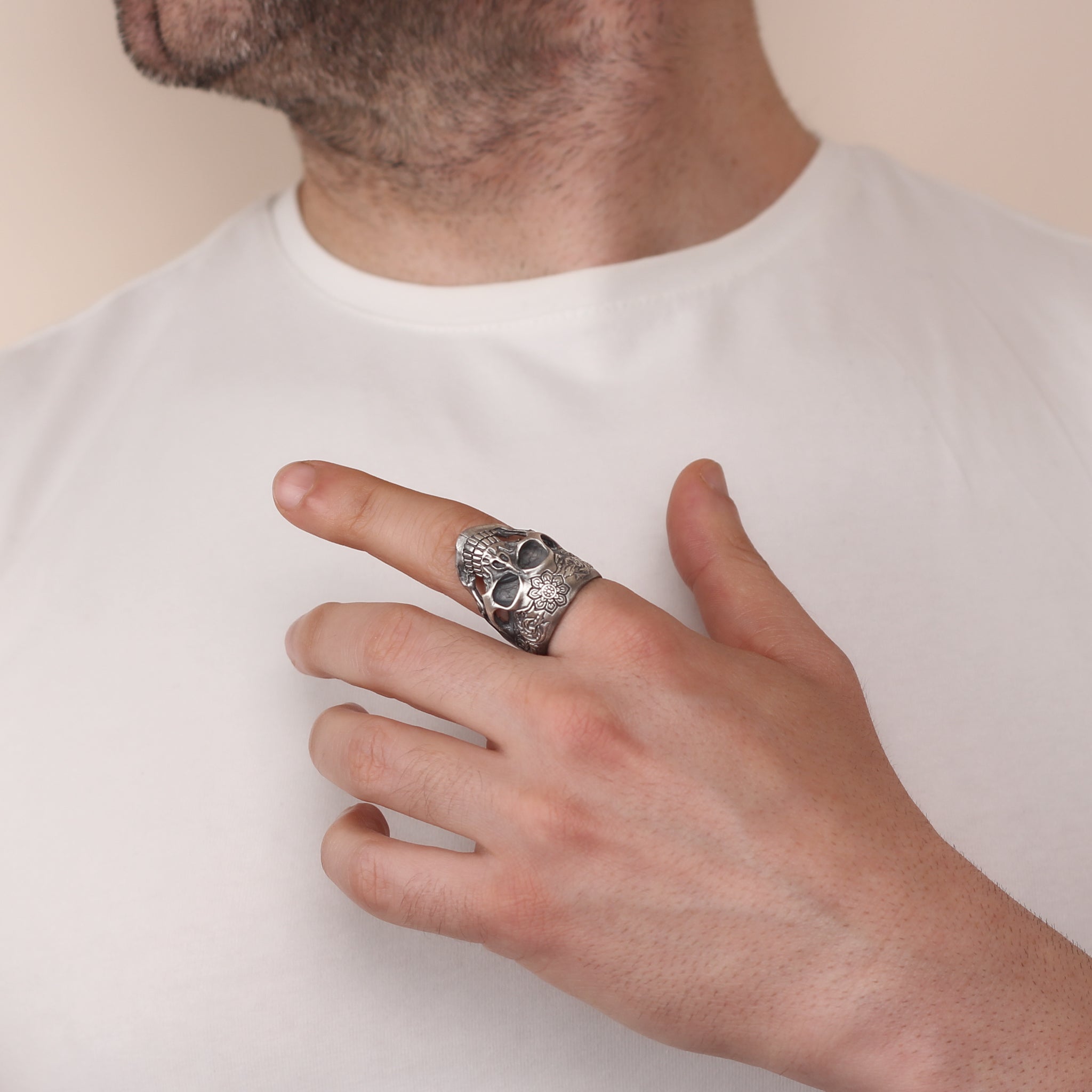 Embrace a perfect blend of boldness and artistry with this Sterling Silver Skull Ring, designed for men who appreciate unique details. The centerpiece features a striking skull, surrounded by intricate floral engravings that add an unexpected touch of elegance and symbolism. Crafted from high-quality 925K sterling silver, this ring is a powerful statement of individuality and style.