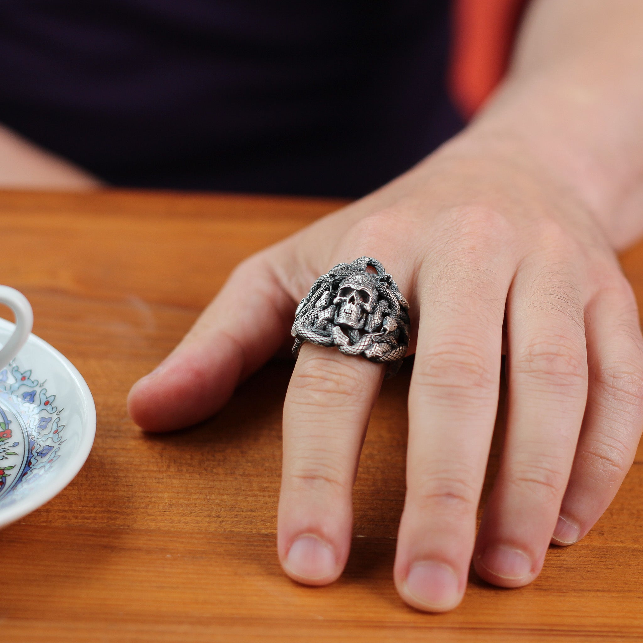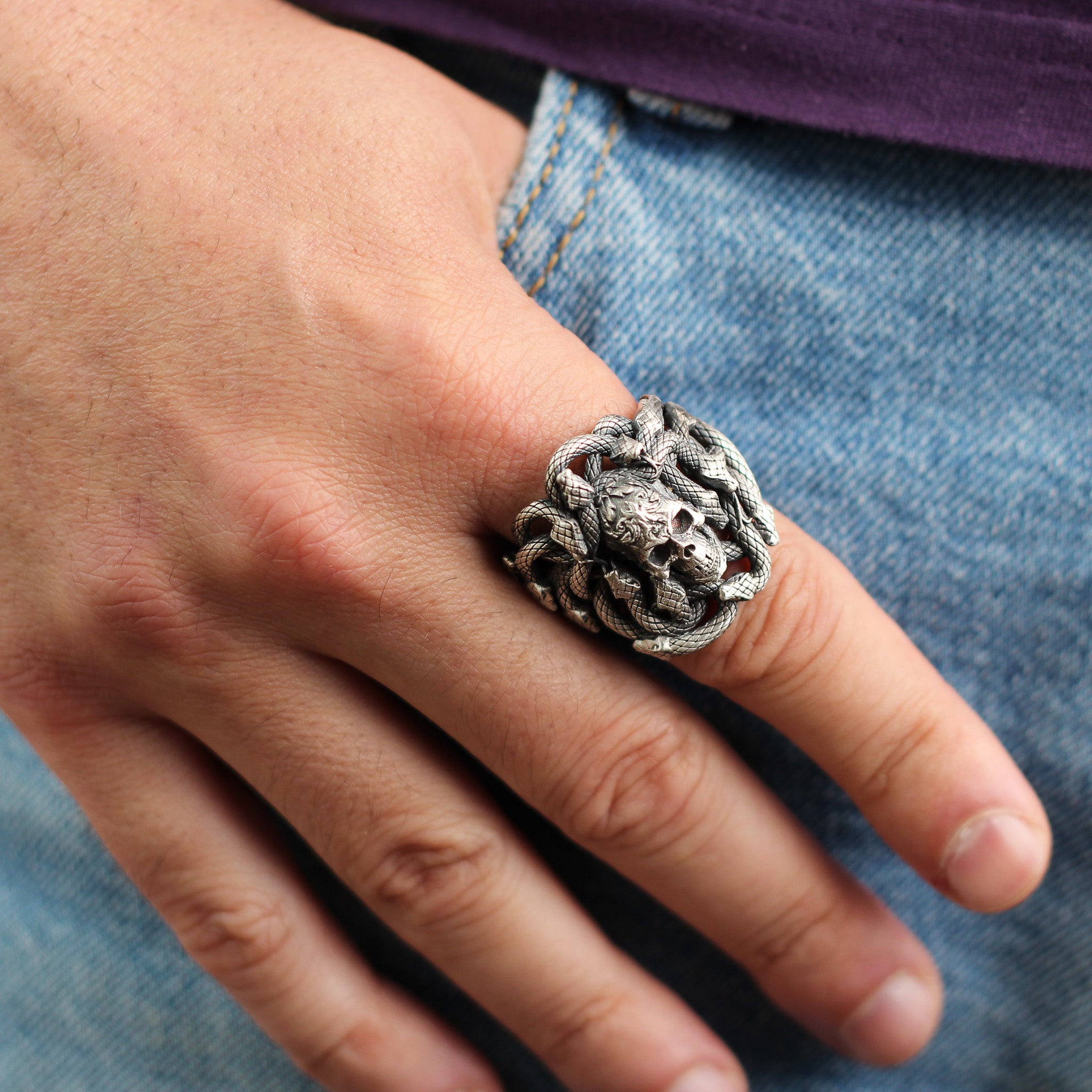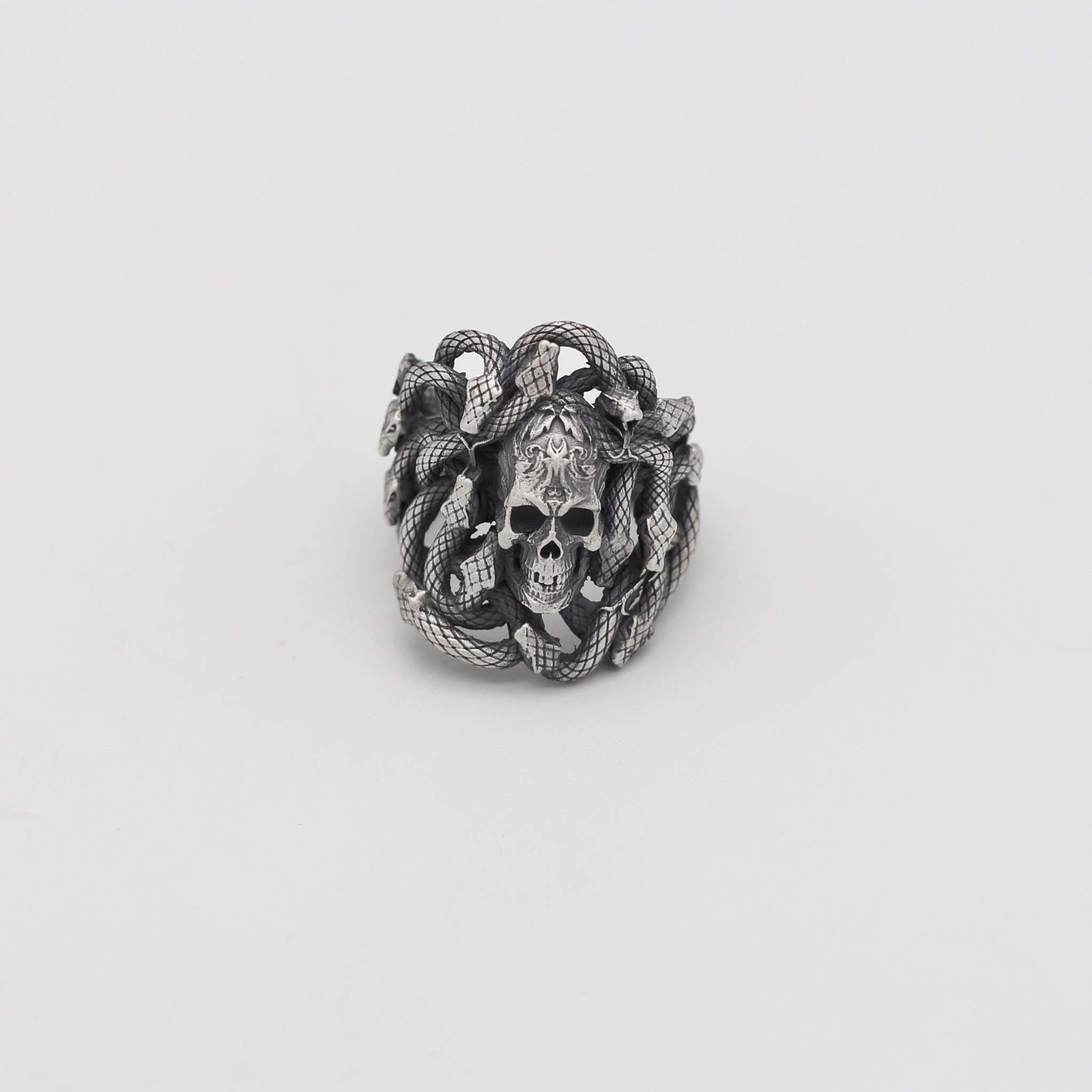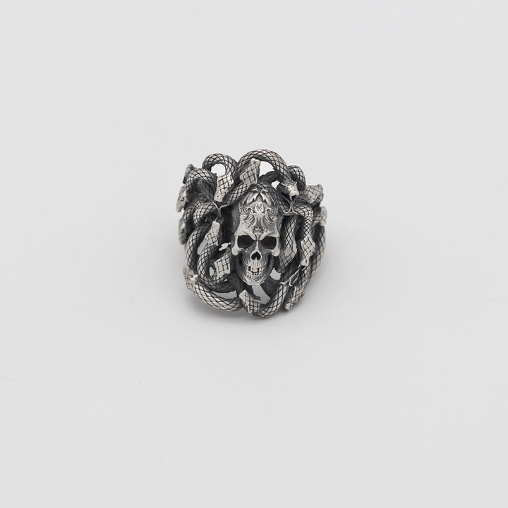 Embrace a bold and edgy aesthetic with this Sterling Silver Snake and Skull Ring for Men. This striking piece features intricately designed snakes wrapping around a detailed skull, symbolizing strength, transformation, and resilience. Crafted from premium 925K sterling silver, this ring is perfect for men who value unique and symbolic accessories.