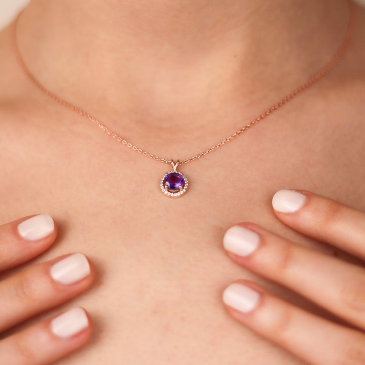 Elevate your elegance with this stunning Natural Amethyst Necklace, showcasing a vibrant oval amethyst gemstone encircled by a dazzling halo of diamonds or zircon stones. Crafted with precision in 925K sterling silver, 8K solid gold, or 14K solid gold, this luxurious pendant exudes sophistication and charm. Perfect for anniversaries, special moments, or as a statement piece, this necklace is designed for those who appreciate timeless elegance.
