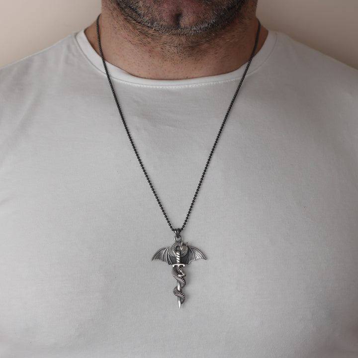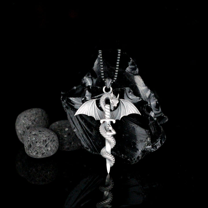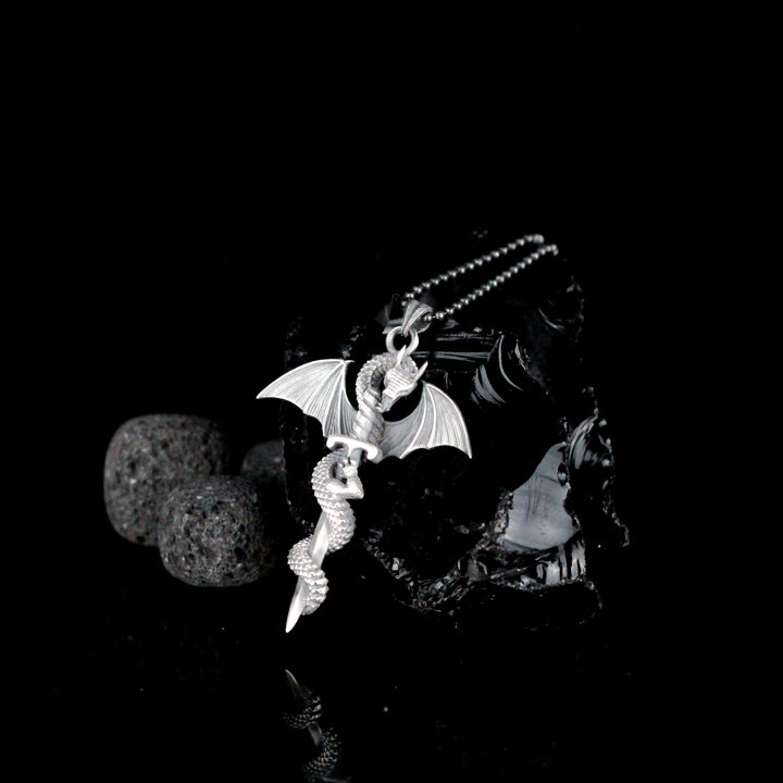 Mythical Dragon Wrap Around Sword Pendant in Sterling Silver | Dragon Jewelry Gift for Men
