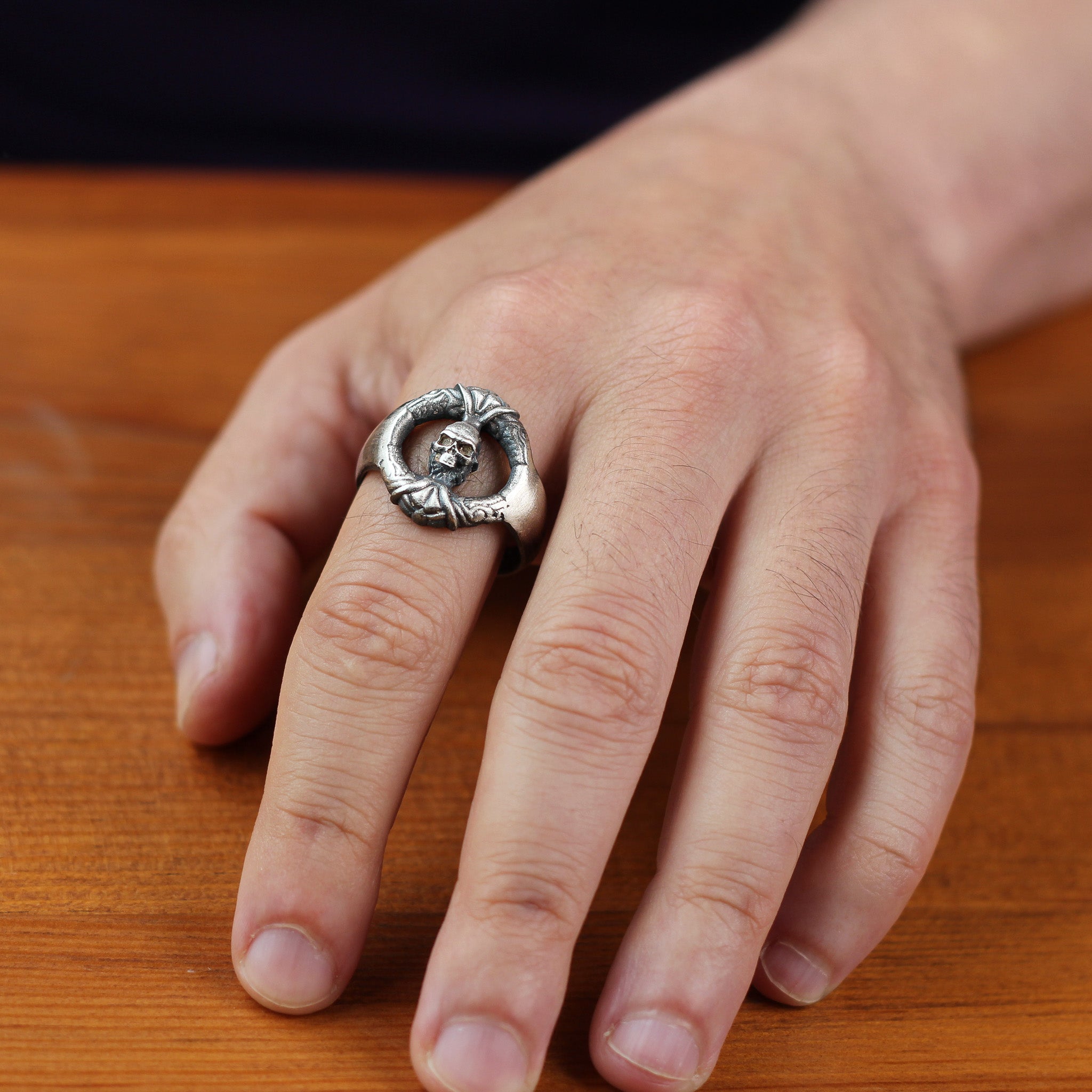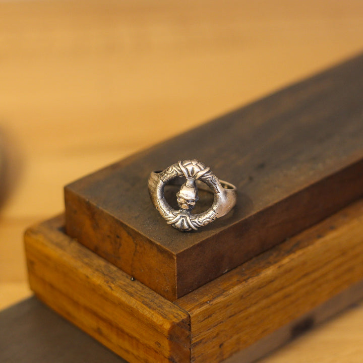 Make a bold statement with this Sterling Silver Skull Wreath Ring for Men. Crafted from premium 925K sterling silver, this unique design features a circular wreath adorned with an intricately detailed skull at its center. Perfect for those who value strength, resilience, and individuality, this ring is a striking addition to any jewelry collection.