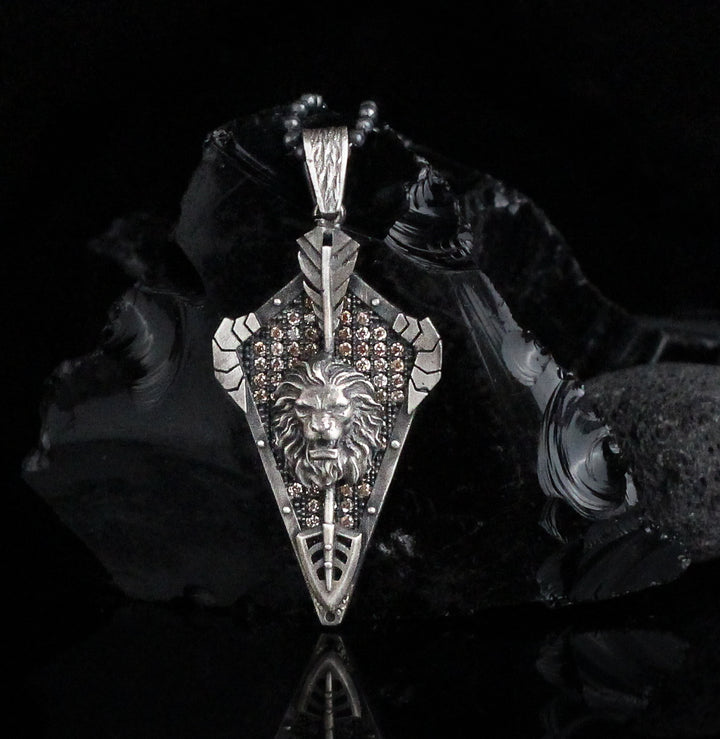 Majestic Lion Shield Pendant Necklace in 925K Sterling Silver | Bold Lion Pendant with Yellow Stone Shield Design