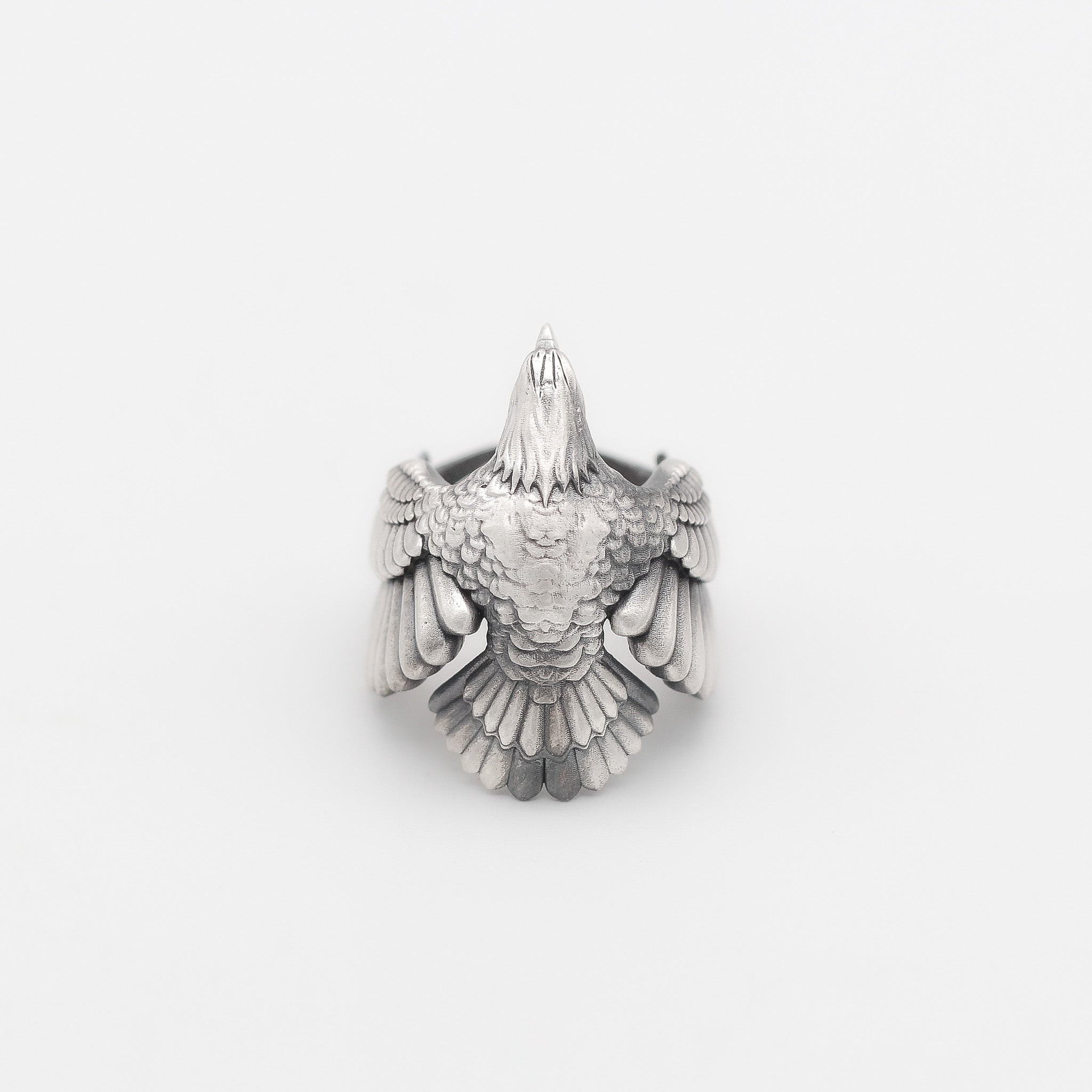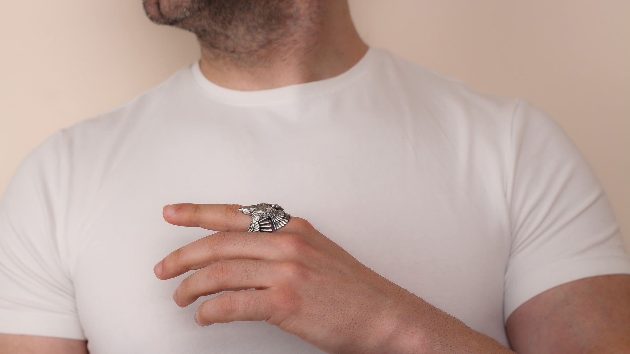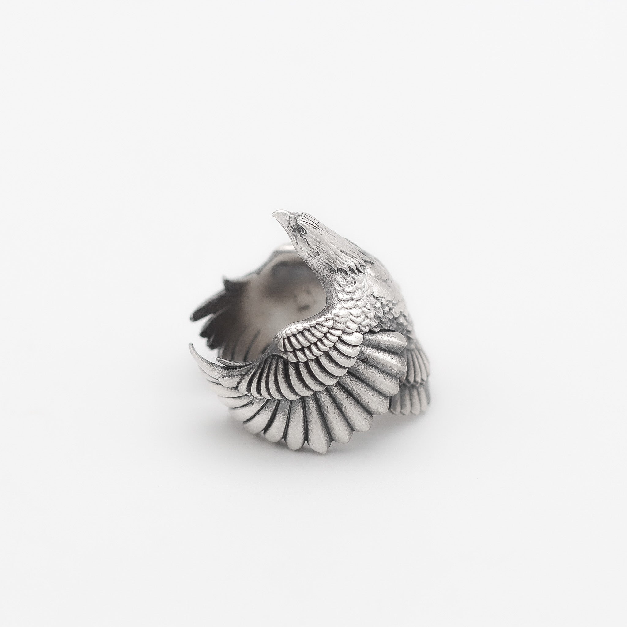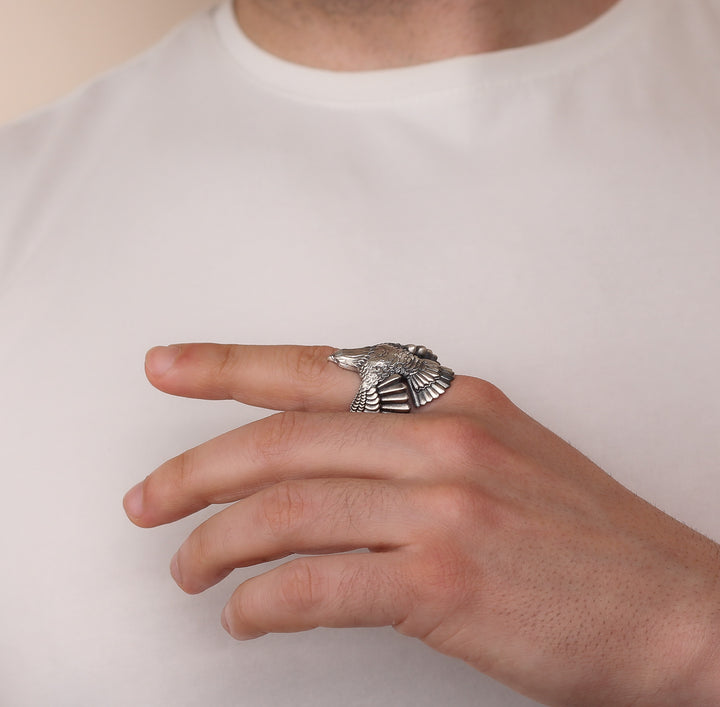 Capture the essence of strength and freedom with this Sterling Silver Eagle Ring for Men, featuring an intricately detailed eagle in mid-flight with outstretched wings. Crafted from premium 925K sterling silver, this striking piece symbolizes courage, leadership, and individuality. Ideal for men who value unique and bold jewelry, this ring is perfect for daily wear or as a statement piece for special occasions.