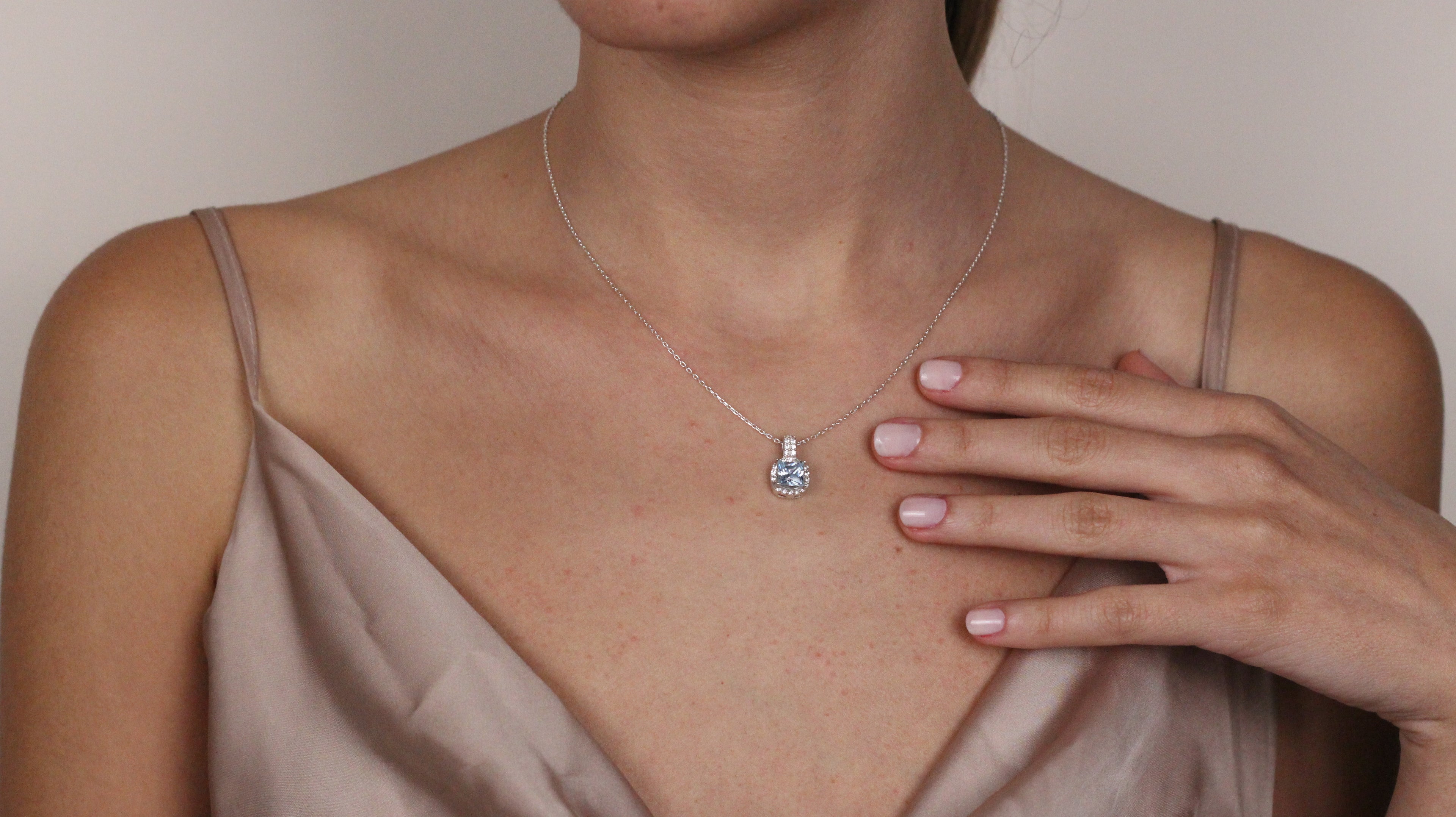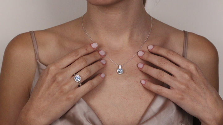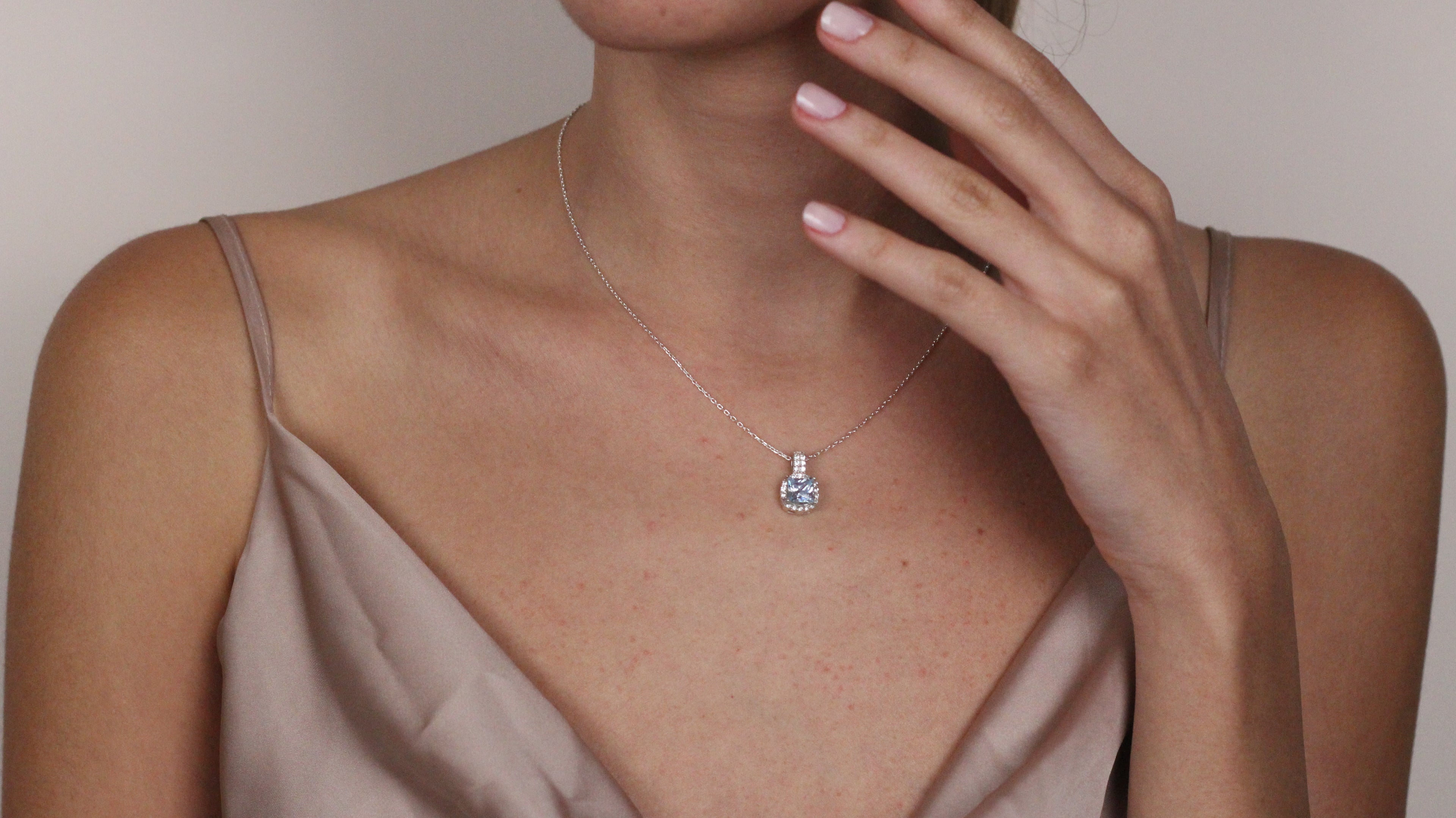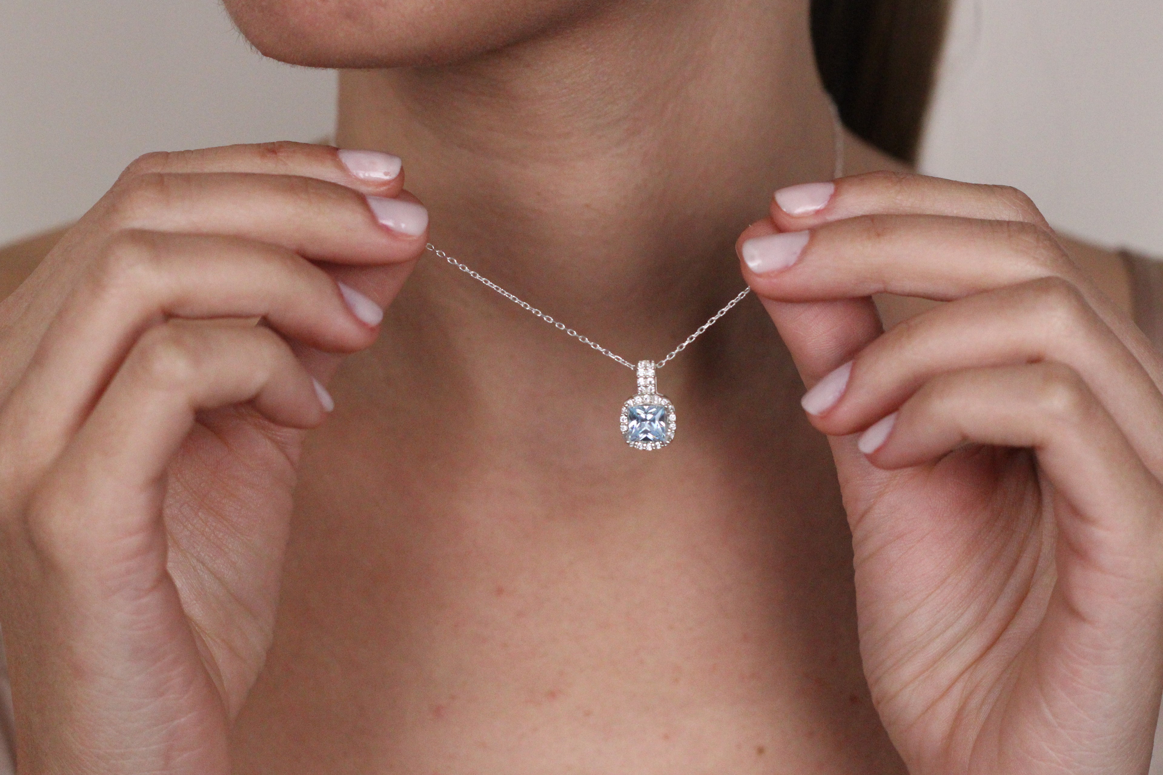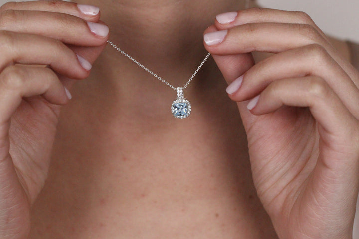 Solid 14K Gold Natural London CZ Blue Topaz Pendant | Cushion Cut Halo Necklace | December Birthstone Jewelry