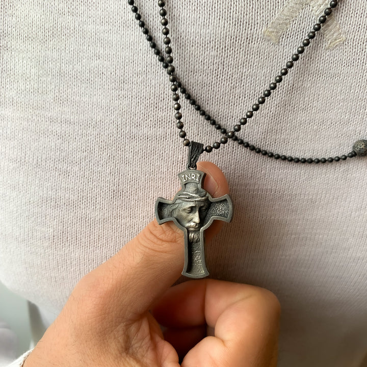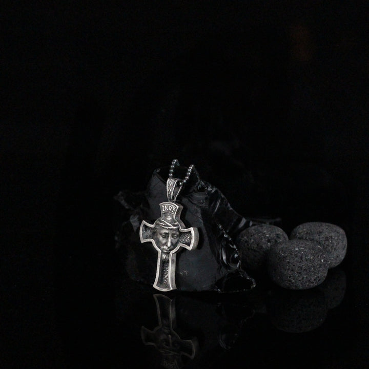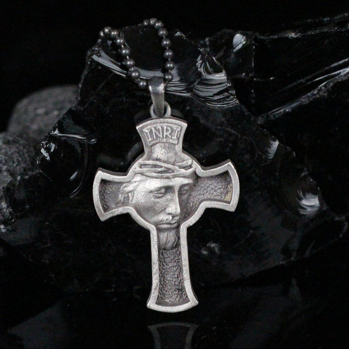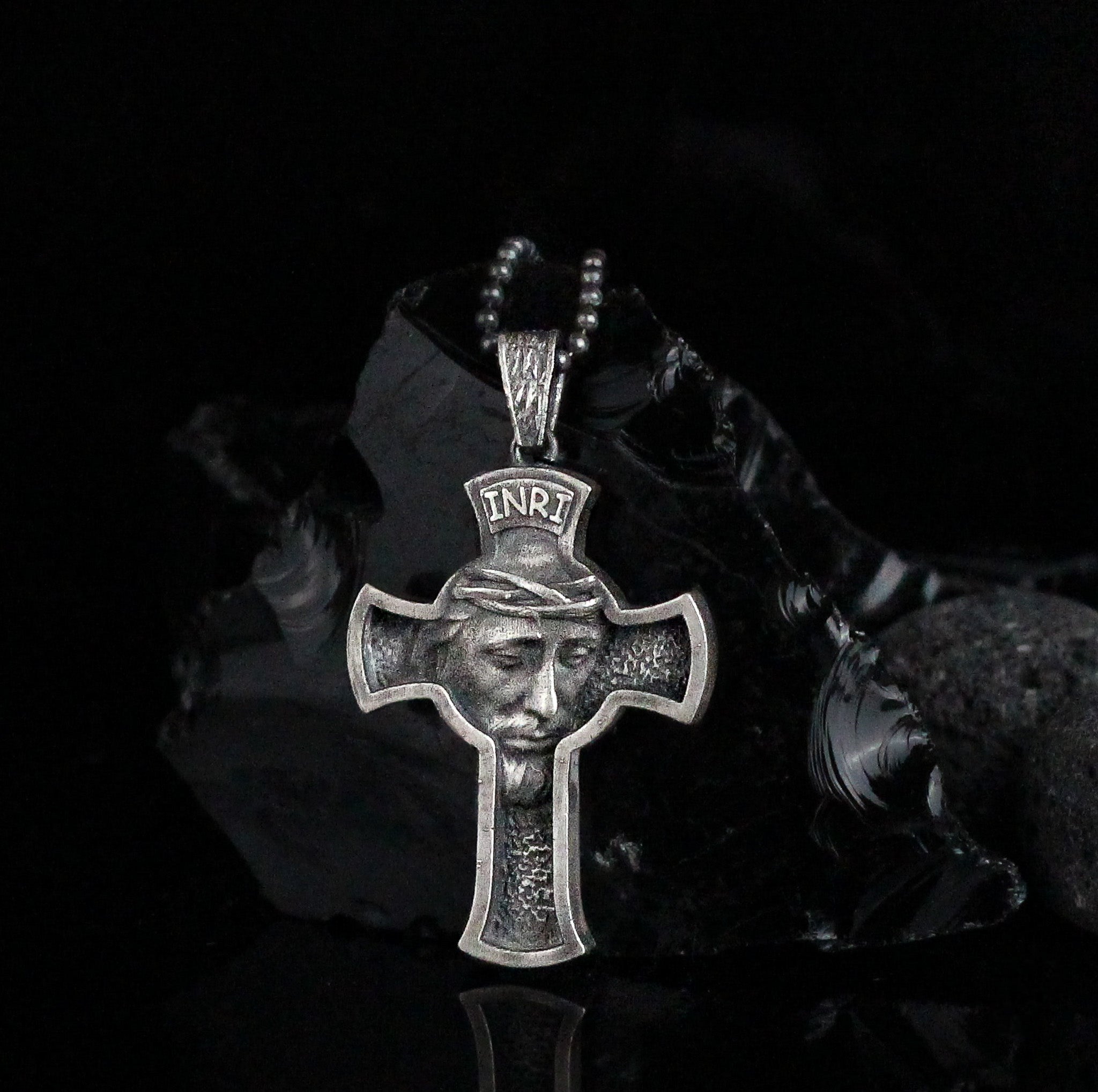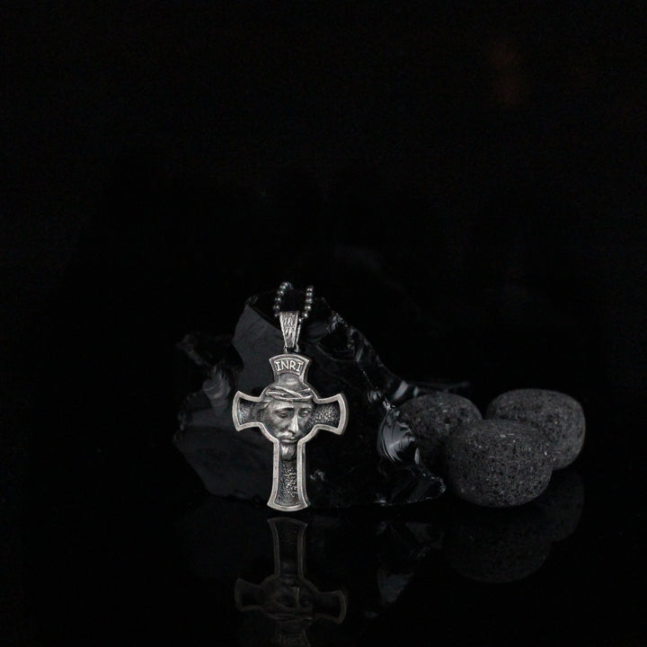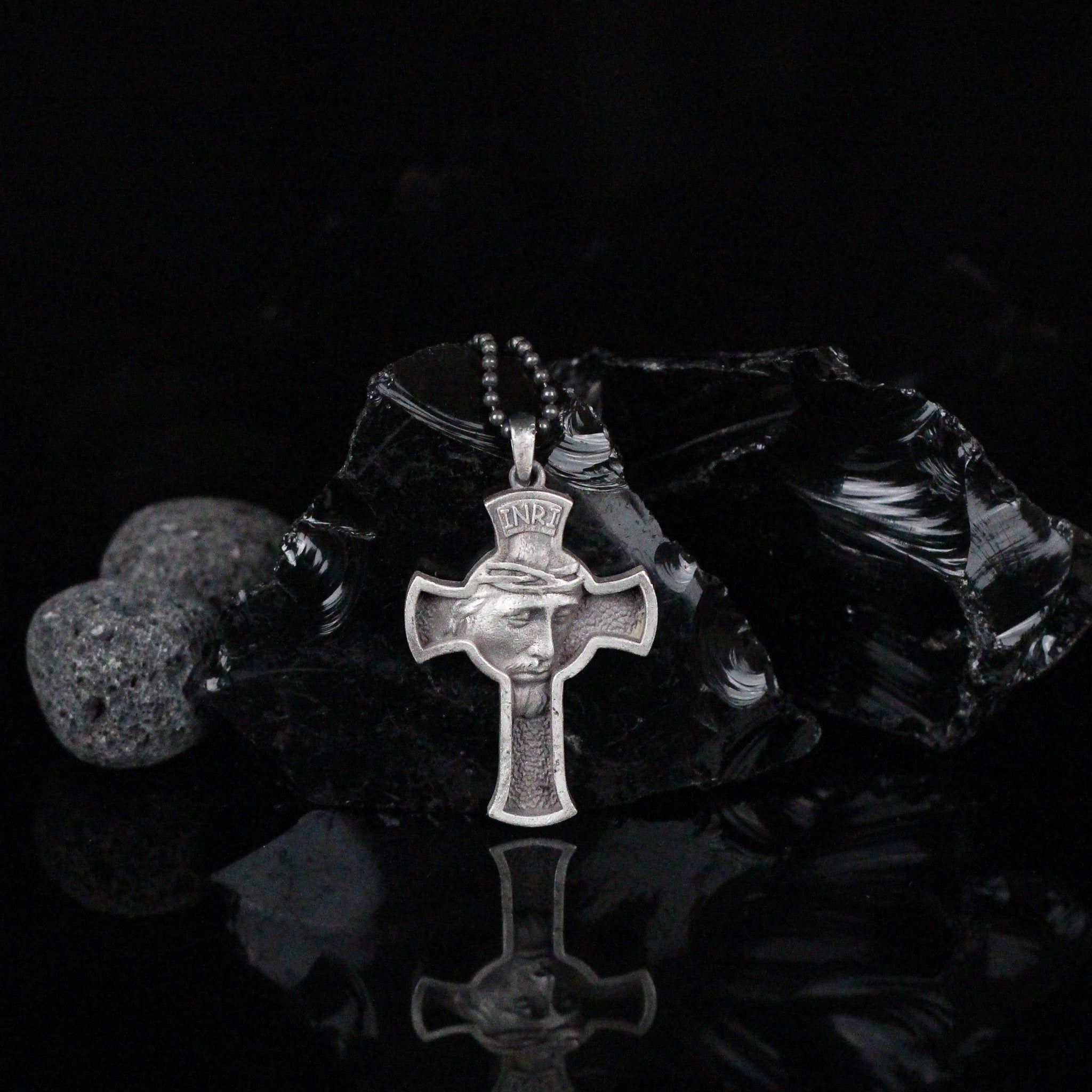 925K Sterling Silver Cross with Jesus Face Necklace | INRI Religious Necklace for Christian Men