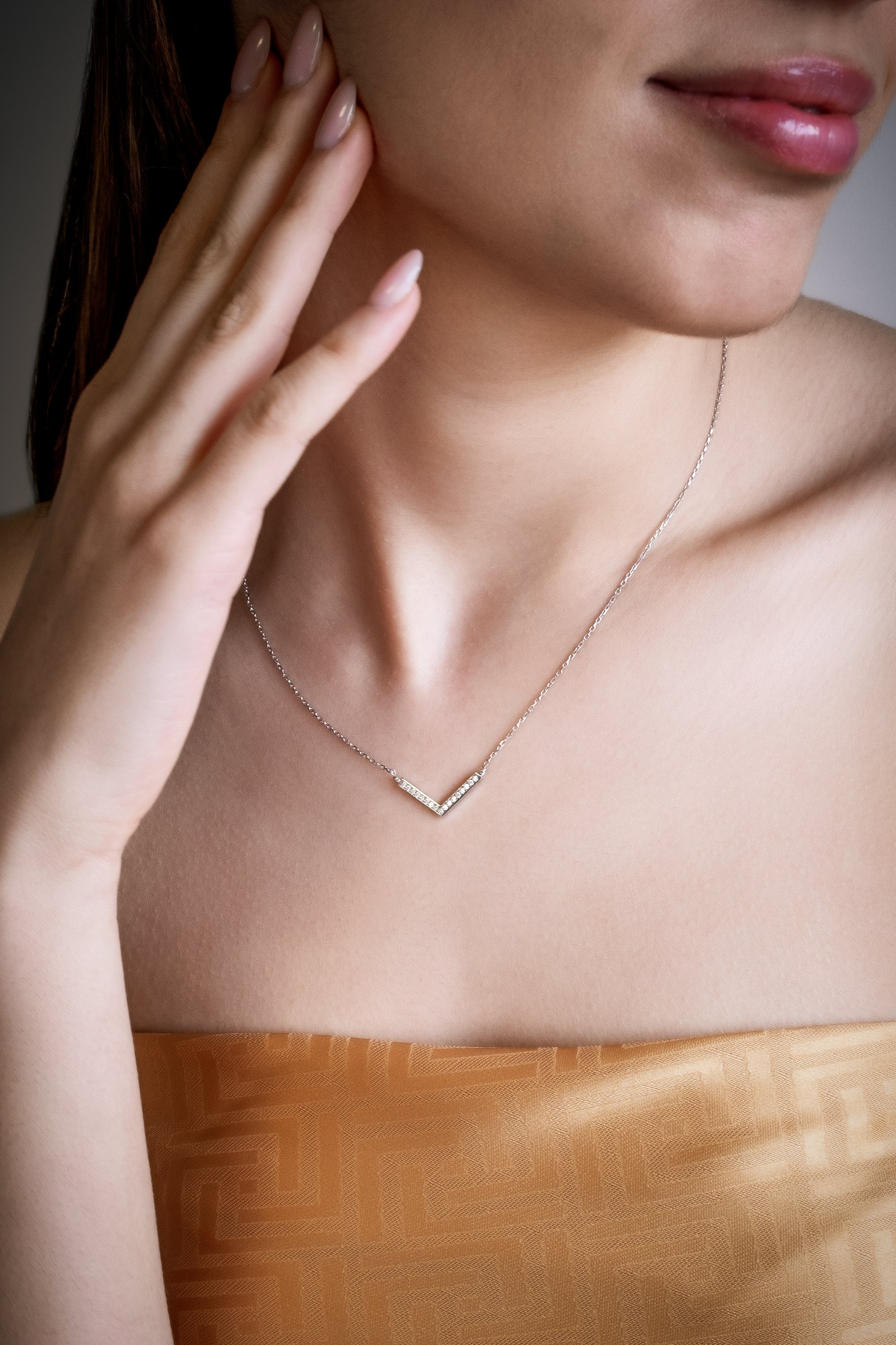 Add a touch of modern elegance to your jewelry collection with this stunning Chevron V Shape Necklace. Featuring a sleek V-shaped design adorned with your choice of shimmering diamonds or cubic zirconia, this pendant is perfect for layering or as a statement piece. Crafted with premium materials, this necklace is a thoughtful gift for anniversaries, birthdays, or simply treating yourself